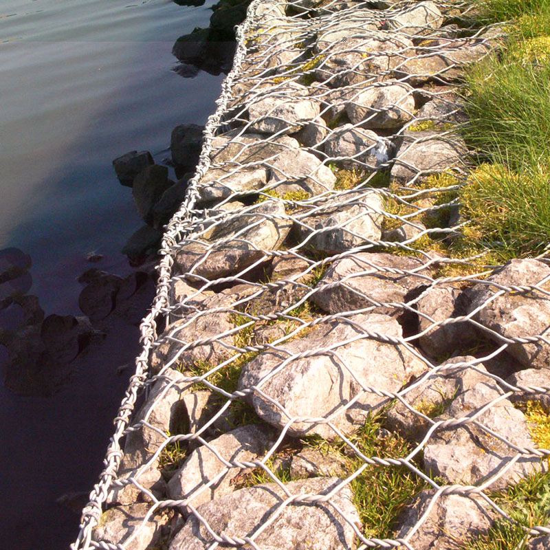 生態(tài)石籠網(wǎng)防護(hù)結(jié)構(gòu)形式:它是指用專(zhuān)用機(jī)械將經(jīng)過(guò)防腐處理的低碳鋼絲雙擰向編織成金屬網(wǎng),按設(shè)計(jì)意圖把網(wǎng)片裁剪、拼裝成矩形或方形的網(wǎng)箱。